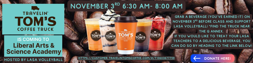 LASA Volleyball is hosting Travelin’ Toms Coffee Truck on November 3rd from 6:30am-8am for Students, Teachers and Staff.