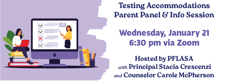 Join us Wednesday, Jan 21 at 6:30 pm via Zoom for the Testing Accommodations Parent Panel hosted by PFLASA. In case you didn’t know, students with existing testing accommodations must apply through College Board (accommodations.collegeboard.org) to receive similar accommodations on tests such as AP exams, the PSAT or the SAT.