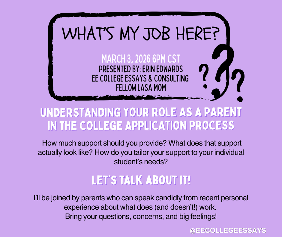 As an essay coach and college consultant, I watch parents struggle mightily every year to figure out what their role in the college application process should be. What’s doing too much? What’s doing too little? What if your student wants you to butt out? What if no matter how many times you yell, plead, and try to inspire, your student isn’t engaging in the process? How much responsibility do you entrust to your student? These are all questions most of the parents I work with don’t know the answer to. This class is about having a very frank discussion through vignettes, concrete examples, and longterm experience about making sure you aren’t going into the college app process with the wrong assumptions about your part in the process. Bring your questions!