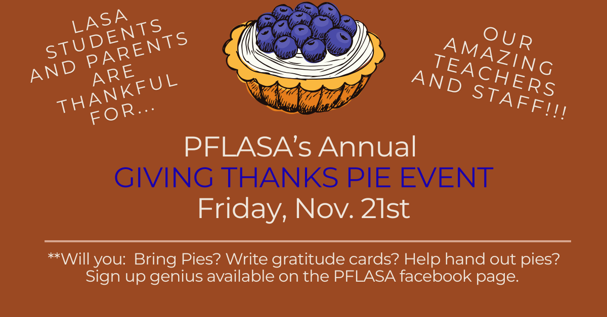 We had a reminder that the Giving Thanks Pie Event is coming right up. Every year, PFLASA coordinates the collection and distribution of holiday pies to show our gratitude for our amazing teachers and staff. If you would like to contribute a pie or other holiday dessert or come help collect and set up desserts on the day-of, look for the Sign Up Genius link that will be coming out soon.