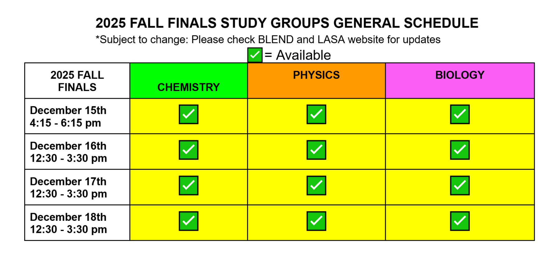 The PFLASA Study Groups Committee continues to work diligently to ensure that this resource is useful and available to all students. We have hired two additional tutors to help out during finals week and next semester.