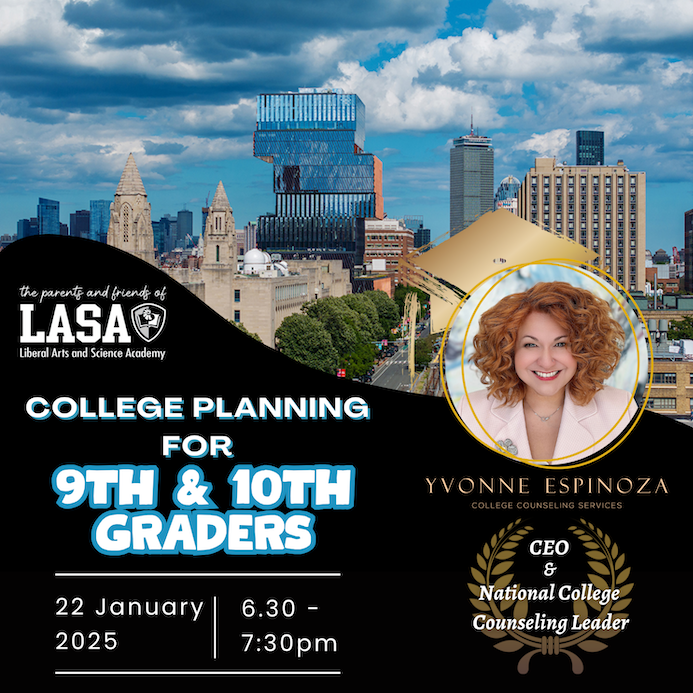 Yvonne Espinoza, CEP, is a national college counseling leader with more than twenty years of experience and has over a decade of experience supporting LASA students and families. She offers contract services as early as the 9th grade and hourly services in middle school because many colleges evaluate students’ freshman year grades and activities during the admissions process, and early planning can also give students more time to explore and prepare. In this session, she will walk families through the steps they can take in 9th and 10th grade to help students learn more about themselves and align coursework and activities with their personal interests and college goals.
